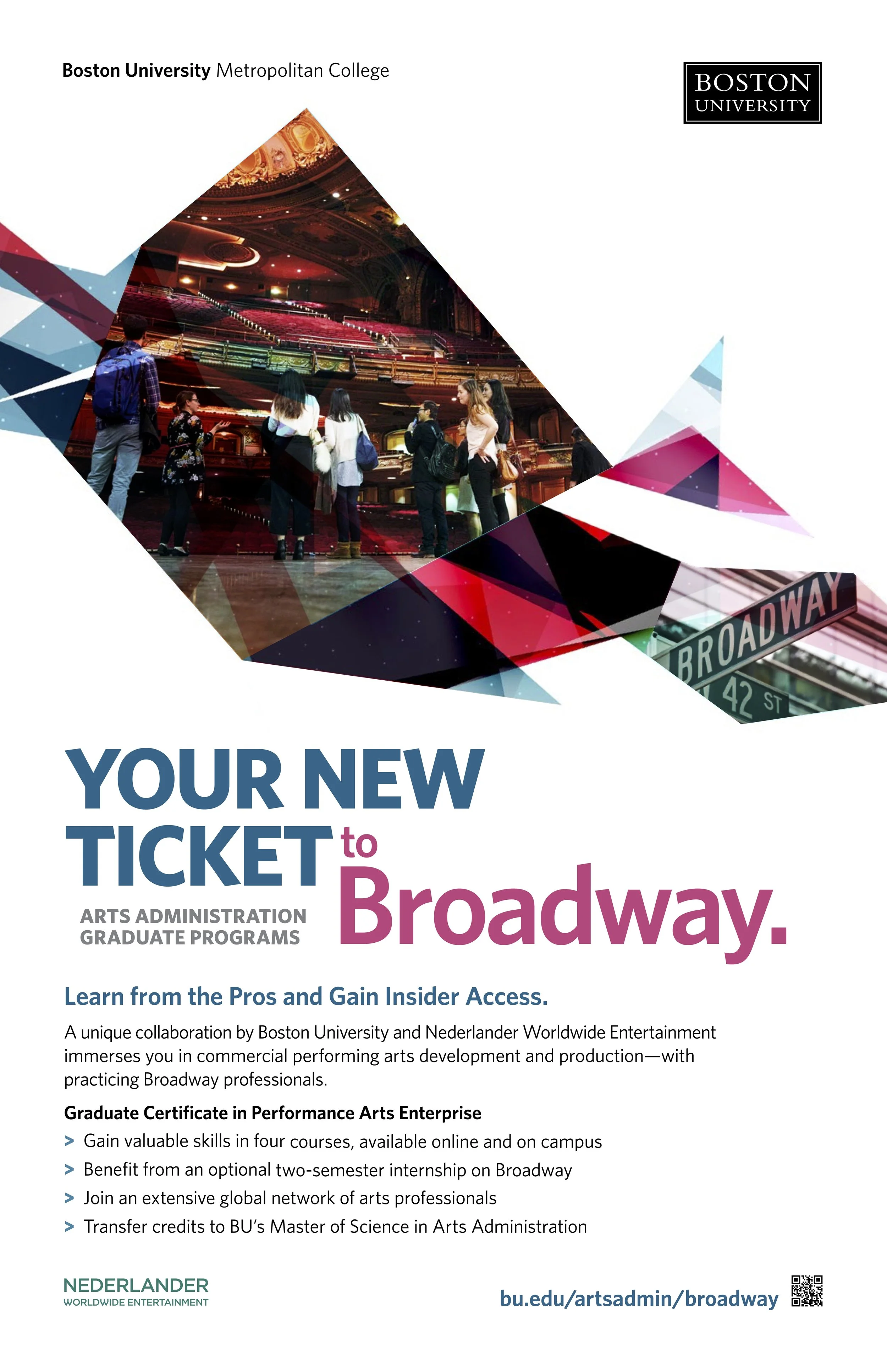 Through an exciting new partnership with Nederlander Worldwide Entertainment, Boston University's Arts Administration Program is now offering a new advanced certificate program to train arts professionals who wish to train in the commercial performing arts.